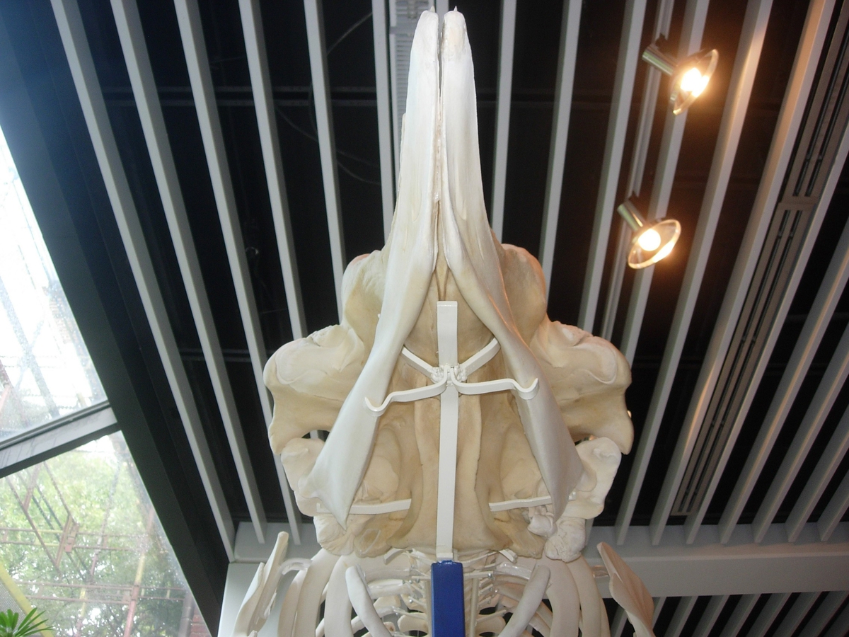 'Det färdigmonterade skelettet av näbbval uppställt utanför lektionssalen en trappa upp från entréplan. Kraniet sett från undersidan. :: :: Skelettet till näbbvalen är monterat och hänger i valsalen på Göteborgs Naturhistoriska Museum. Då näbbvalen sågs utmed kusten kom den att kallas Valder i media. :: :: Ingår i serie med fotonr. 7106 med bilder på näbbvalen som levande och under arbetet med att montera skelettet.'