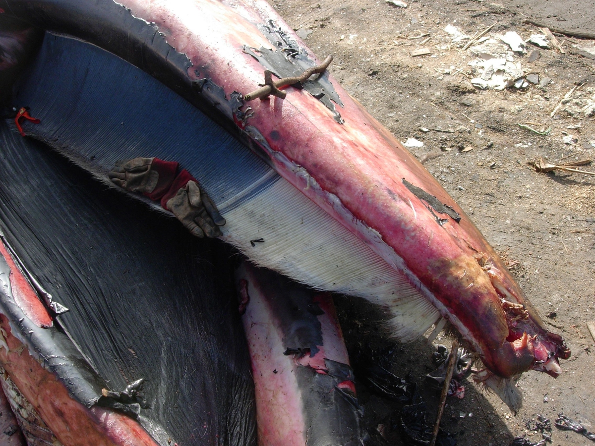 'Bilder på en död sillval innan den grävdes ner: :: Närbild på barderna (högra sidans). :: :: Ingår i serie med fotonr. 7107:1-5.'