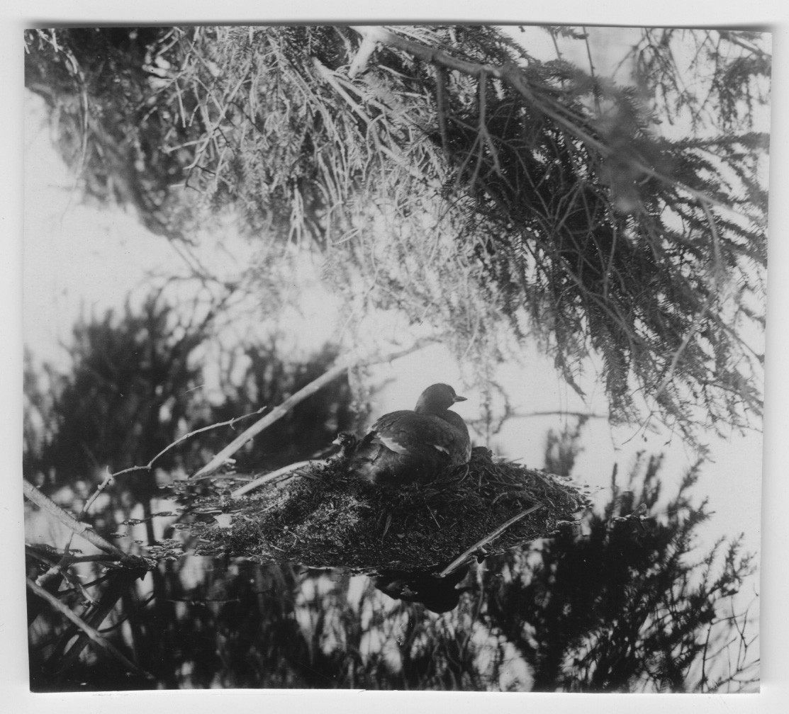'Dopping, hona med bo och ungar, i en gran. :: :: Ingår i serie med fotonr. 709-713.'