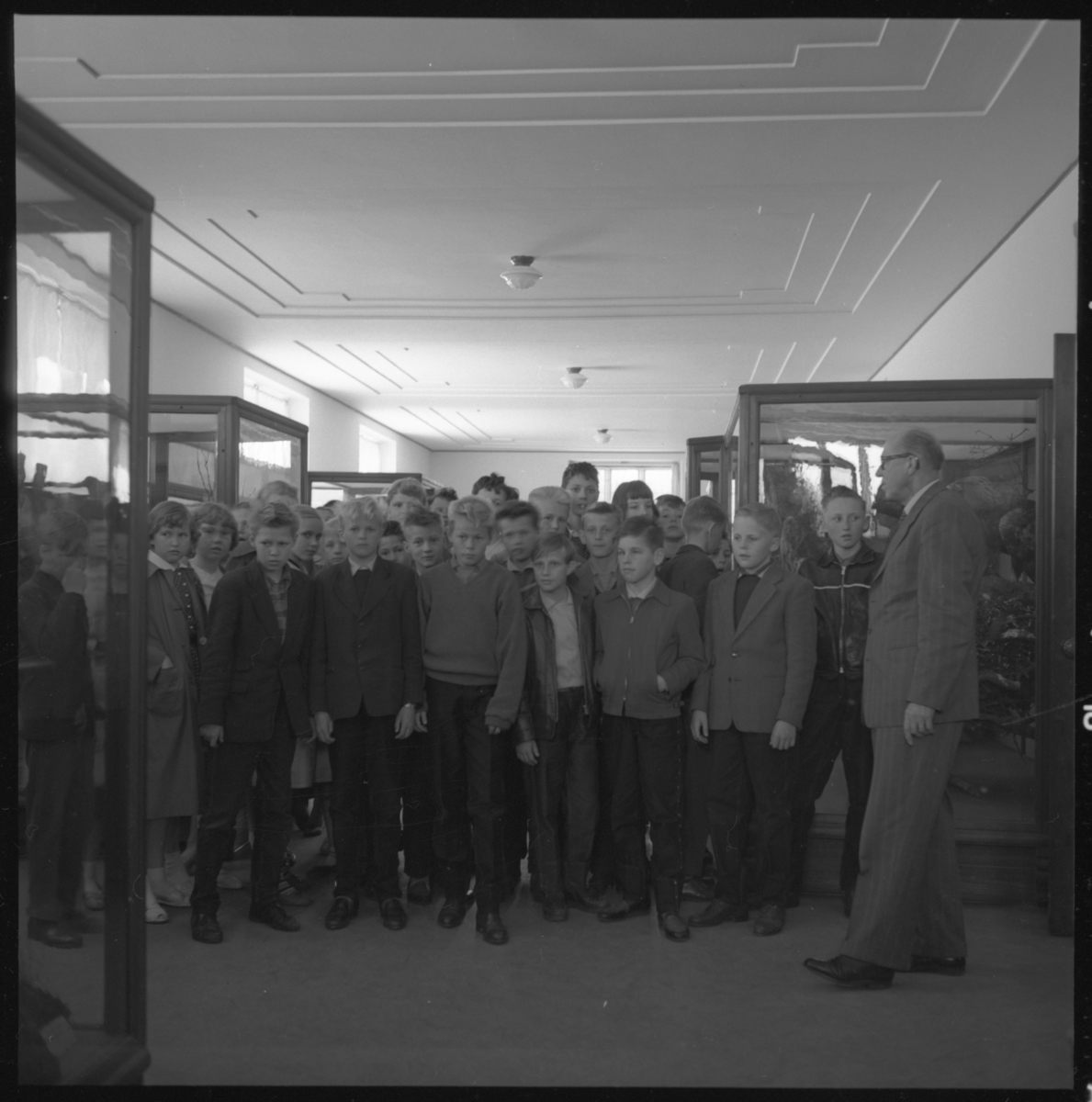 'Grupp barn, ungdomar, flickor men mestadels pojkar samlade i grupp i gång med utställningsmontrar i fågelgången. Framför gruppen står 1 man. Kläder. Klädsel. Elever? Lektion? :: :: Ingår i serie med fotonr. 7120 med diverse bilder från Hans Lohmander.'