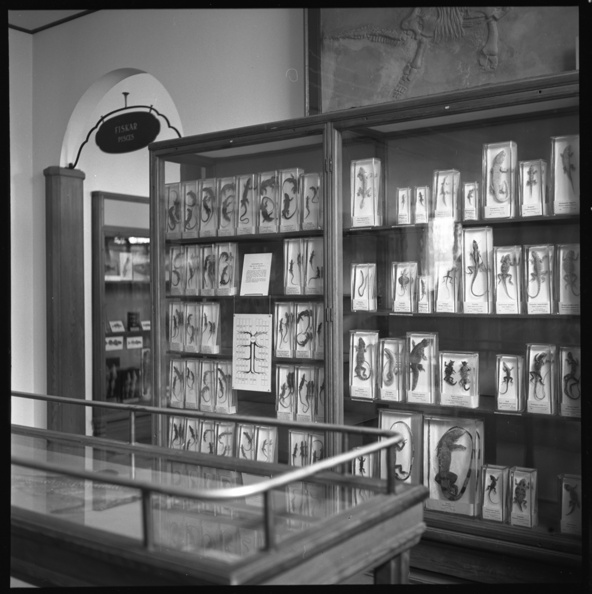 'Del av utställningsdelen med groddjur och krälddjur, synligt monterskåp med diverse ödlor. Framför skåpet ett bord med glasskiva. I bakgrunden skylt med texen ''Fiskar (Pisces)''. Bakom väggen fiskavdelninegn. Till vänster gången från grod- och kräldjursavdelningen mot fiskavdelningen. :: :: Ingår i serie med fotonr. 7120 med diverse bilder från Hans Lohmander.'