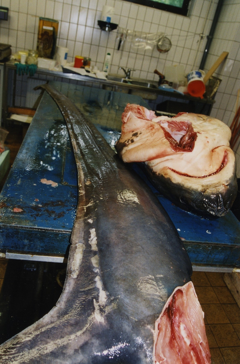 Rävhaj inför skellettering i flårummet på Göteborgs Naturhistoriska Museum, huvud och stjärtfena