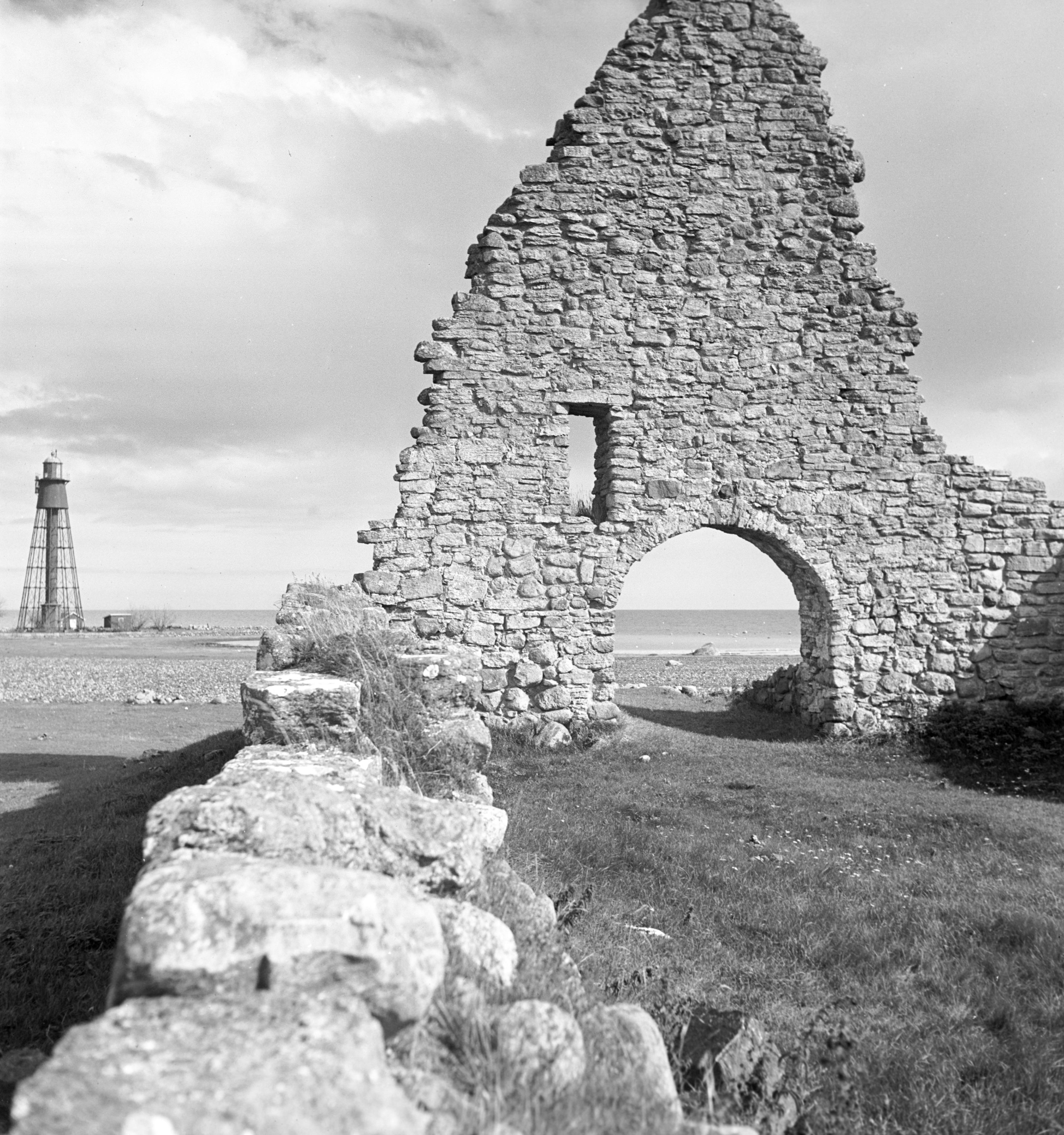 Raä-nr: Bredsättra 90. Ruinen kallas även Långöre kapell. I bakgrunden fyren.