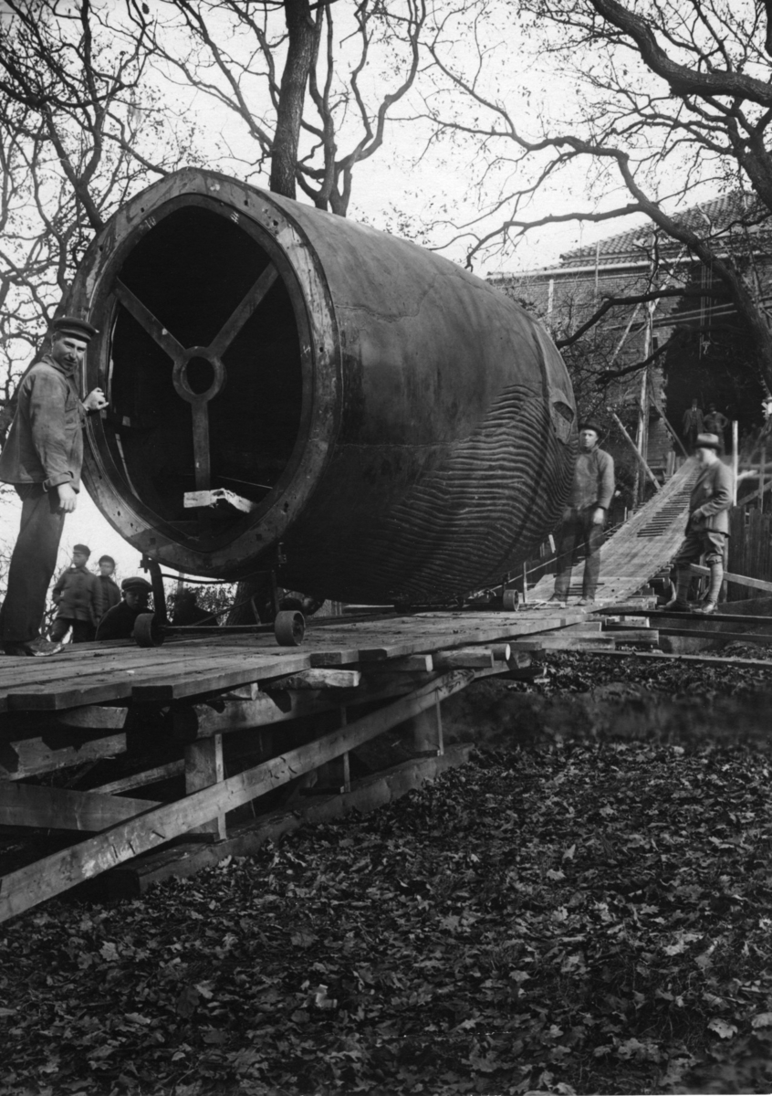 'Zoologiska avdelningens flytt: :: :: Största valsegmentet drages upp för landgången till Slottsskogsmuseet. Malmska valen. 3 män vid trärampen med valsegmentet. I bakgrunden skymtar museibyggnaden.'