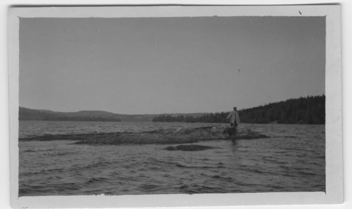 'Storlom, platsen för boet, i sjö. Man stående med käpp på liten holme i vattnet. :: :: Nid.av. 453, Coll.an. 4361. Fynddatum: 1922-05-23. :: :: Ingår i serie med fotonr. 788-790.'