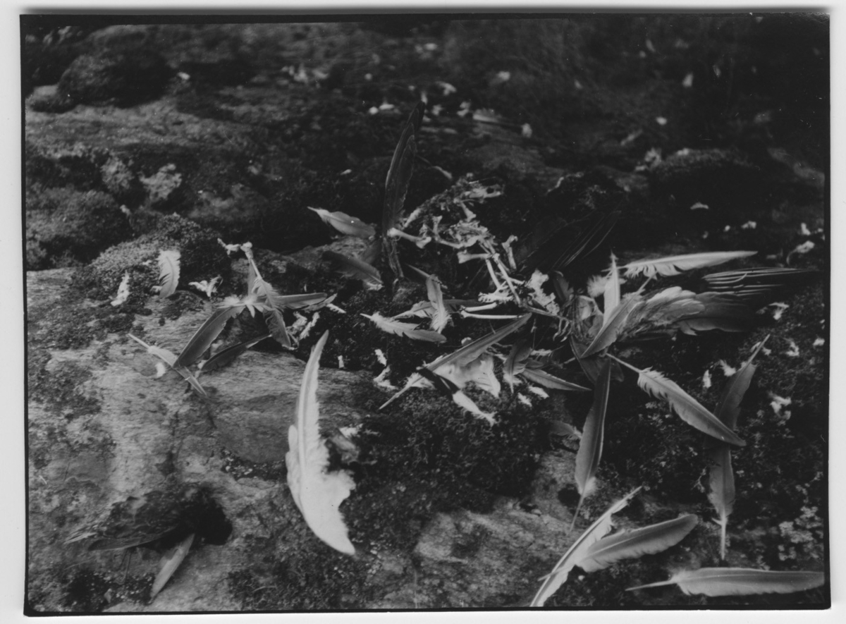 'Pilgrimsfalkens ''Kökkenmödding''.Närbild. Liggande på berghäll. :: :: Ingår i serie med fotonr. 817-841.'