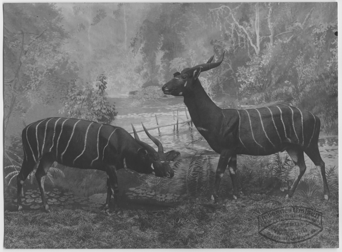 Skogsantilop, hane & hona. Monterade i miljö. Stämpel på framsidan.