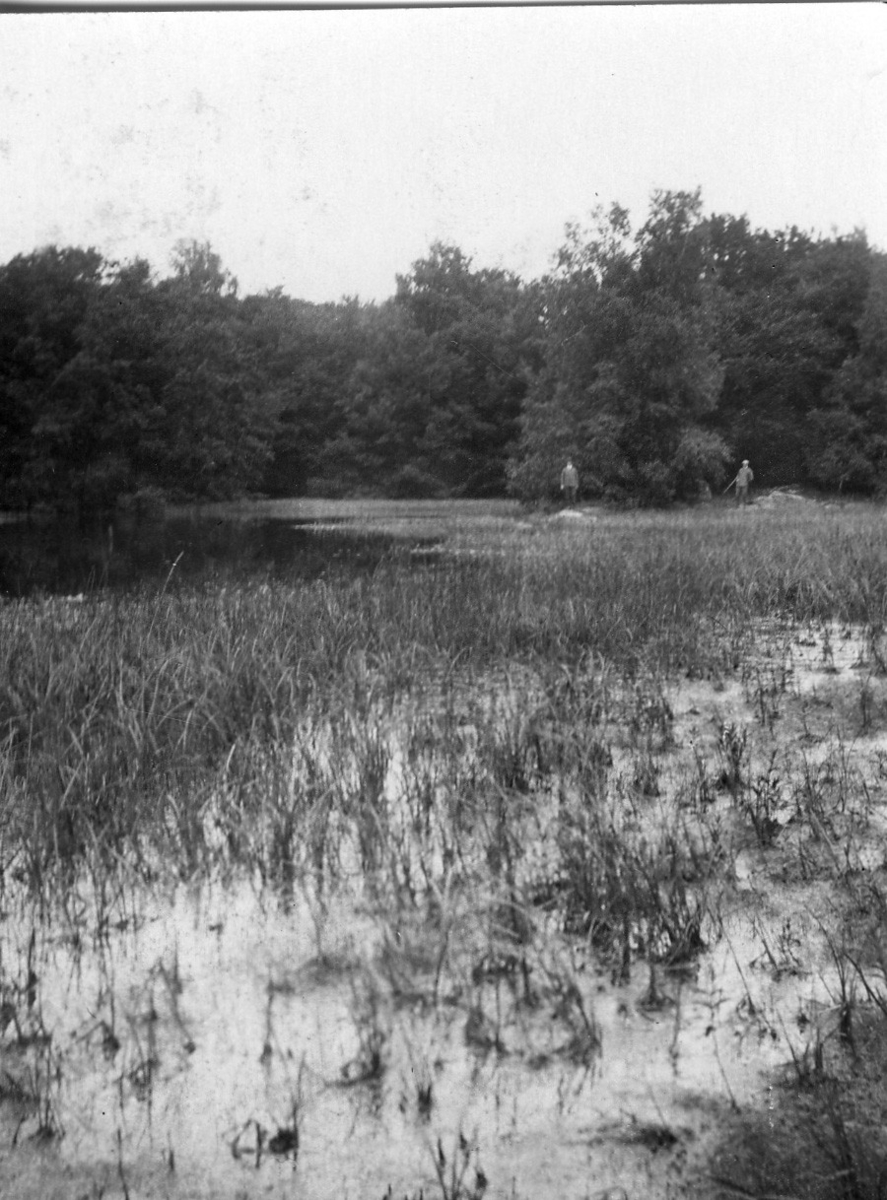 'Vy med kärr och i bakgrunden skog. 2 personer syns på bilden samt trädvegetation i fonden. :: :: Ingår i serie med fotonr. 862-871.'