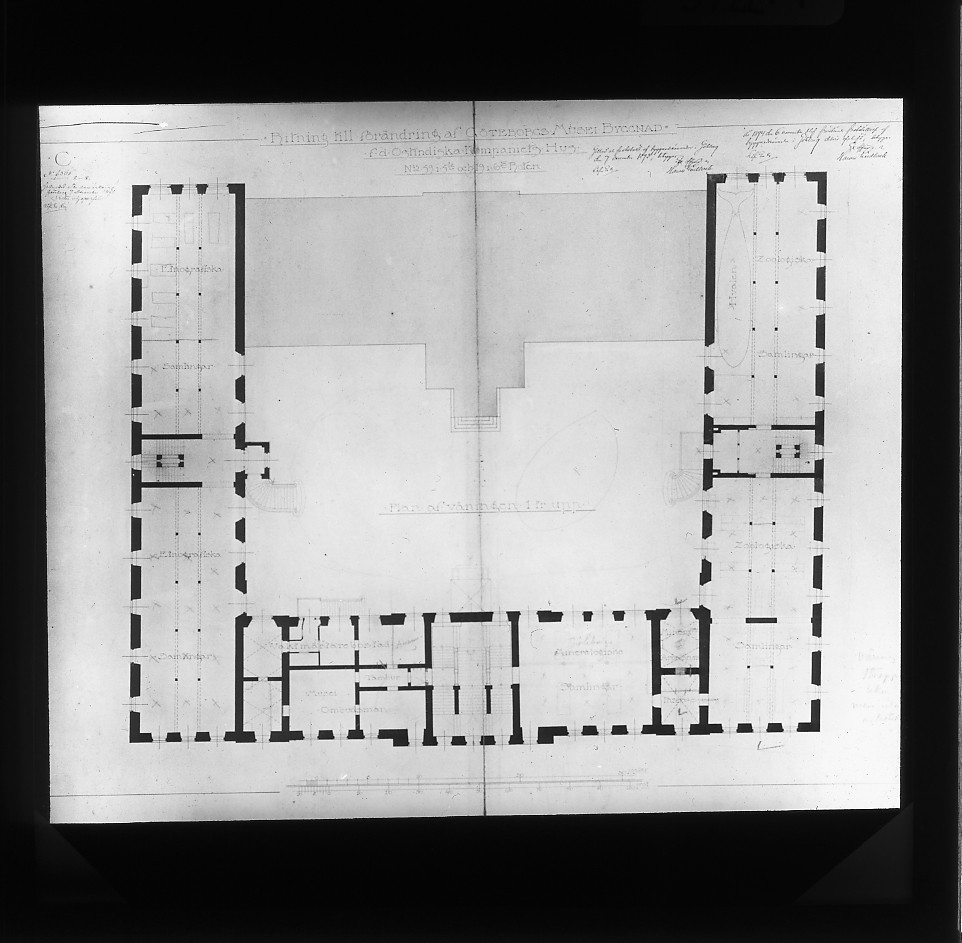 'Avfotograferade ritningar till Gamla museet. :: :: ''Plan af våningen 1tr upp''.'