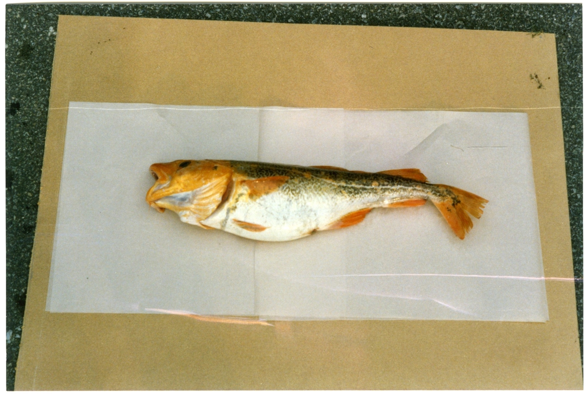 'Torsk i närbild liggande på duk. Torsken rödfärgad. Helbild och närbild på huvudet. :: :: Se även fotonr. 6064:2.'