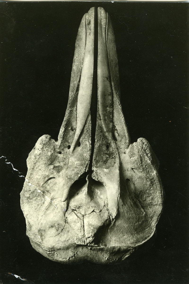 'Vitnosdelfin, Lagenorhynchus albirostris Gray enligt Gen.kat. Skalle sedd ovanifrån. Fynddatum 1920. :: :: Vitsiding (enligt baksidan på fotografiet) , skalle sedd ovanfrån. 1920-09. :: se även fotonr. 1043 :: :: :: Bilden med i Göteborgs Naturhistoriska museums Årstryck 1921 s.40'