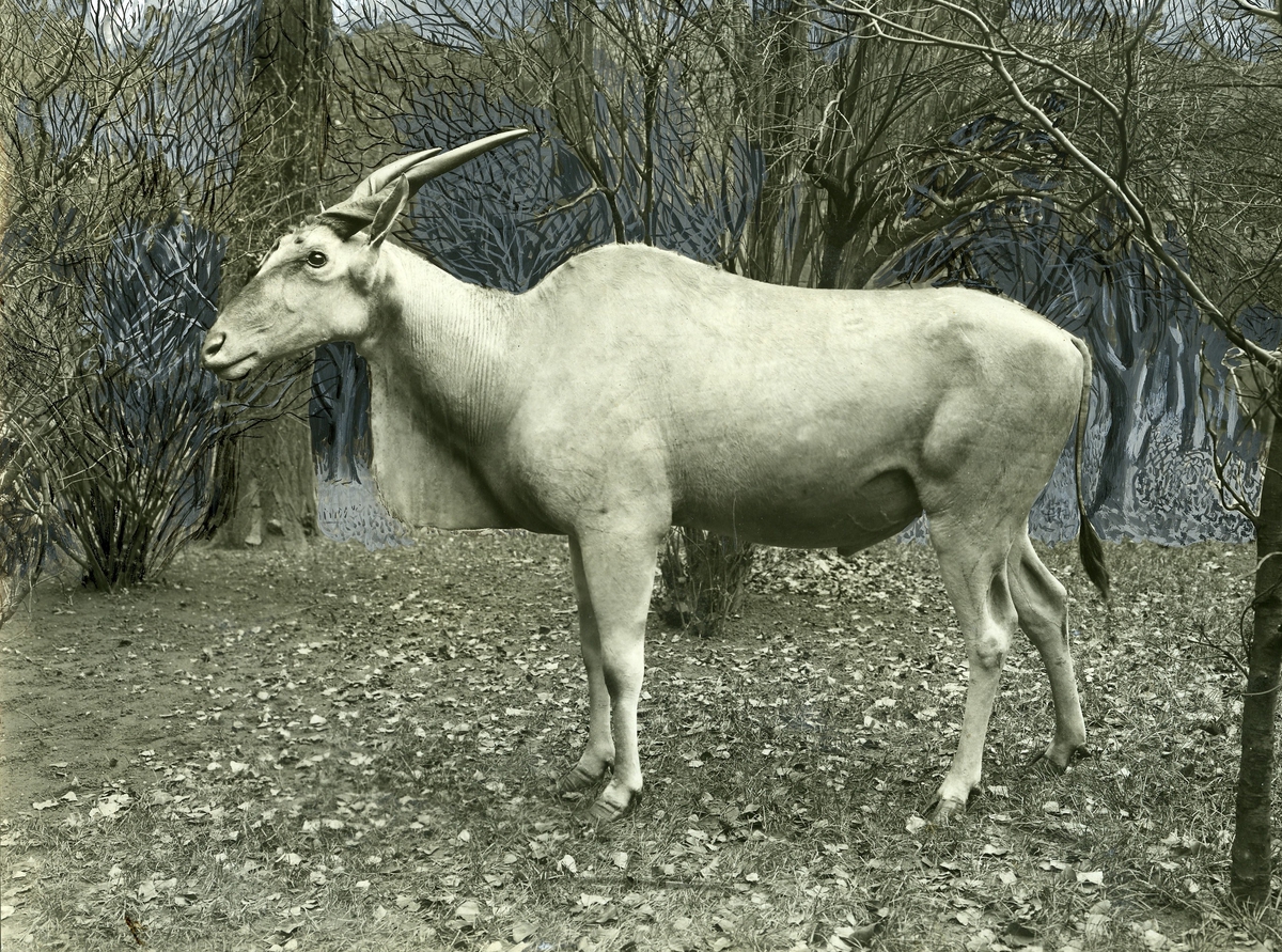 'Elandantilop (älgantilop), hane, färdigt montage. Samma fotografi som 611:2 men maskerad, inför tryck, så att byggnaden är borta och träd lagts till. :: :: Montaget finns utställt i däggdjurssalen i monterskåp nr. 49 på Göteborgs Naturhistoriska Museum. :: :: Ingår i serie med fotonr. 613:1-3.'