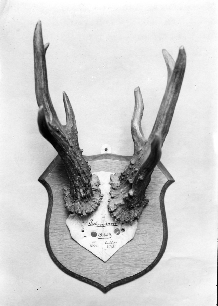 Rådjurshorn, 8 spetsade, sedda framifrån. Monterad.