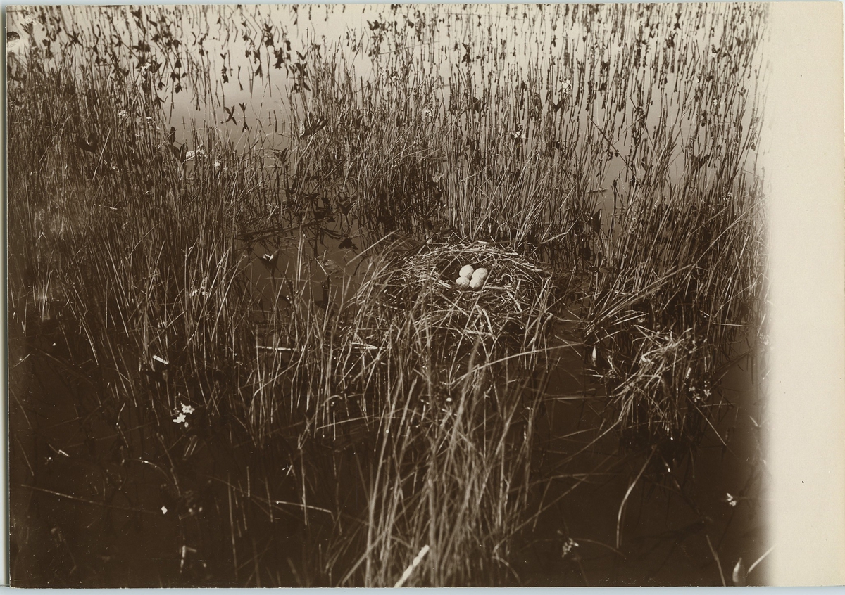 'Gråhakedopping, bo med 4 ägg flytande i vatten inne i vassen, säv. :: :: Se fotonr. 66-69.'