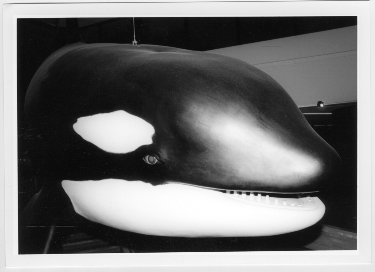 'Modellen av späckhuggaren, närbild på huvudet. Ingick i valutställningen. :: :: Ingår i serie med fotonr. 6765:1-39.'