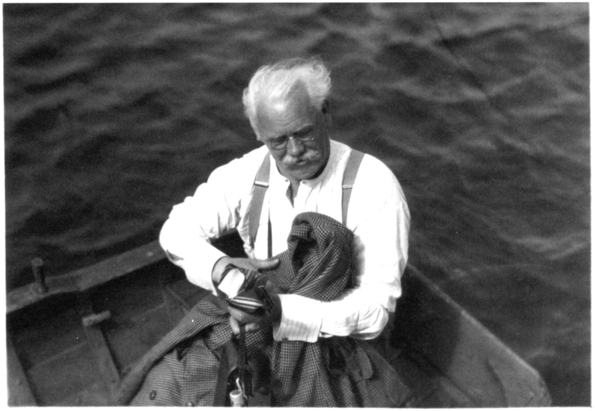 'Bildtext enligt Årtrycket 1999: ''Konservatorn i båten är Hilmer Skoog. Konservatorn mediterar.'' :: Hilmer Skoog sittande i träbåt med kavaj, rock i famnen. Närbild. :: :: Ingår i serie med fotonr. 6765:1-39.'