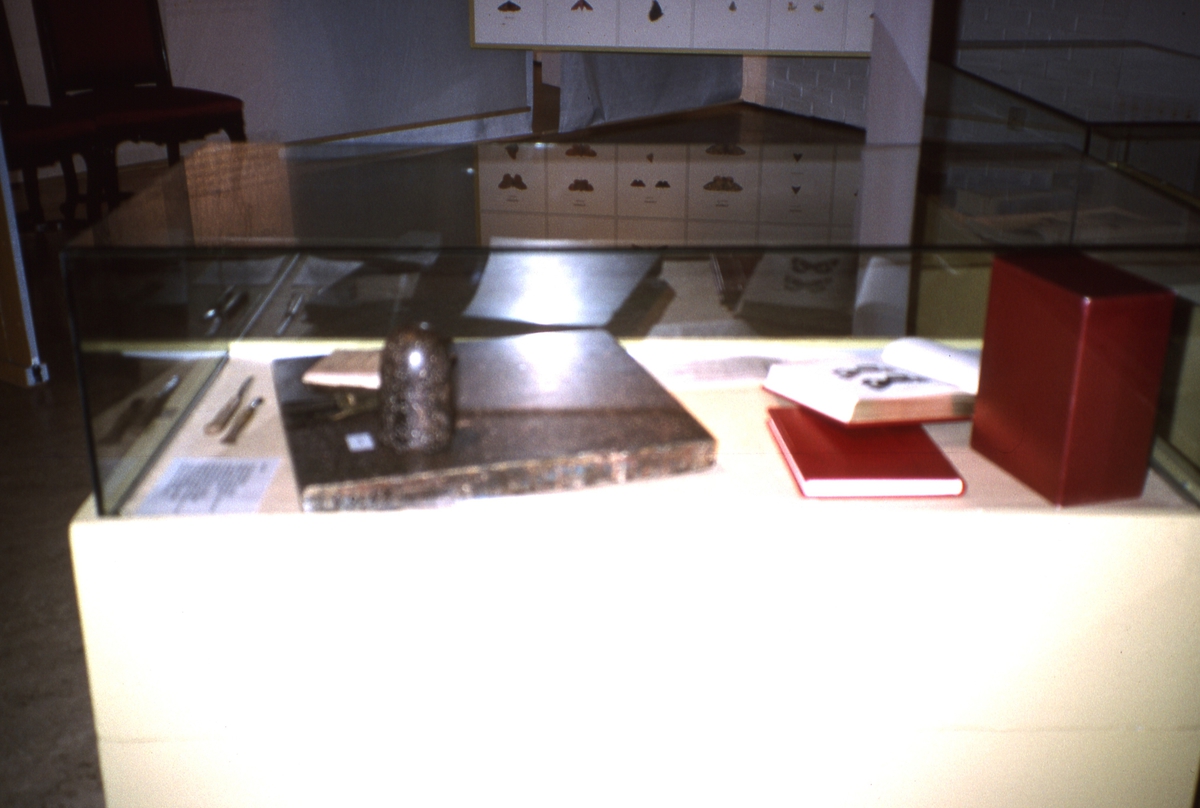 'Motiv av utställningen om konstnärsbröderna von Wright på Göteborgs Naturhistoriska museum: :: :: Glasmonter med böcker och föremål. :: :: Ingår i serie med fotonr. 6938:1-35.'