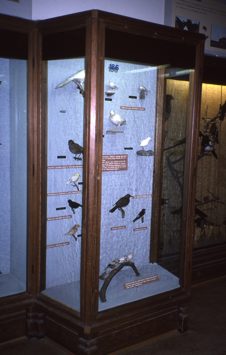 'Montrarna i fågelgången fotograferade före restaurering. :: Svenska fåglar. Fjäderdräkt. :: :: Ingår i serie med fotonr. 6939:1-54.'