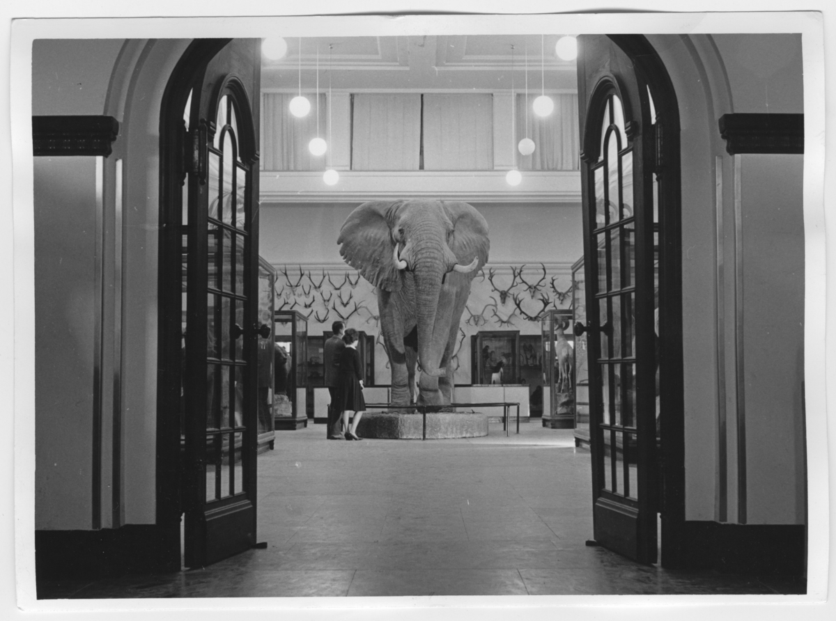'Motiv av elefanten sedd framifrån genom valvporten. 2 personer, 1 kvinna och 1 man, står invid elefanten. 8 klotformade lampor i taket. :: :: Ingår i serie med fotonr. 6959:1-21.'