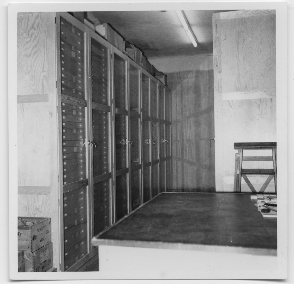 'Everteskåp med lådor i gamla magasinet. :: Snäckskåp i gamla magsinet :: Ingår i serie med fotonr. 6964:1-11.'
