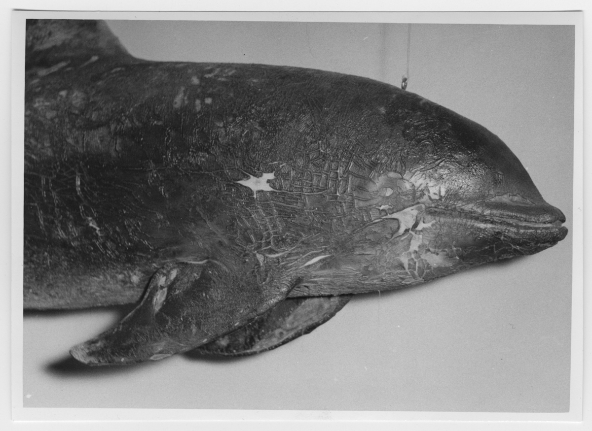 'Delfin hängande i utställningen. Skinnet sprucket. :: :: Se även fotonr. 6964:4 och 5. :: :: Ingår i serie med fotonr. 6964:1-11.'