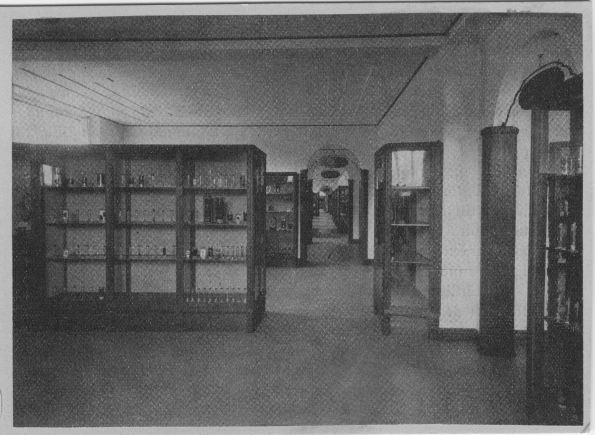 'Gång med utställningsmontrar med glascylindrar och glasburkar innehållande preparat. ''Utställningssalen för ryggradslösa djur''. Basutställningen.'