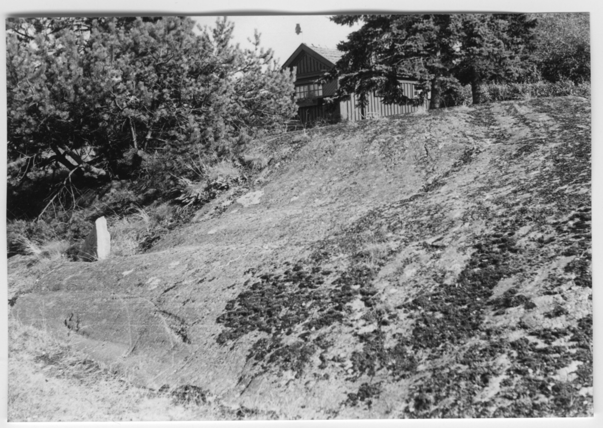 'Närbiild. Bildtext: ''Häll med räfflor och plastisk skulptur. Räfflornas riktning 240 grader.'' Lavbevuxen häll nedanför trähus. Trekantigt mindre block med någon form av information, ser ut att stå P i en cirkel bl.a. :: :: Ingår i serie med fotonr. 6970:1-1125, dokumentation av Hisingens naturgeografi, visande landskapsformerna i stora drag och gjord inför exploateringen av området. Platserna för fotograferingen finns utsatta på karta i skala 1:4000 som finns på Göteborgs Naturhistoriska musem. Fotoriktningen mättes med kompass i gammalgrader.'