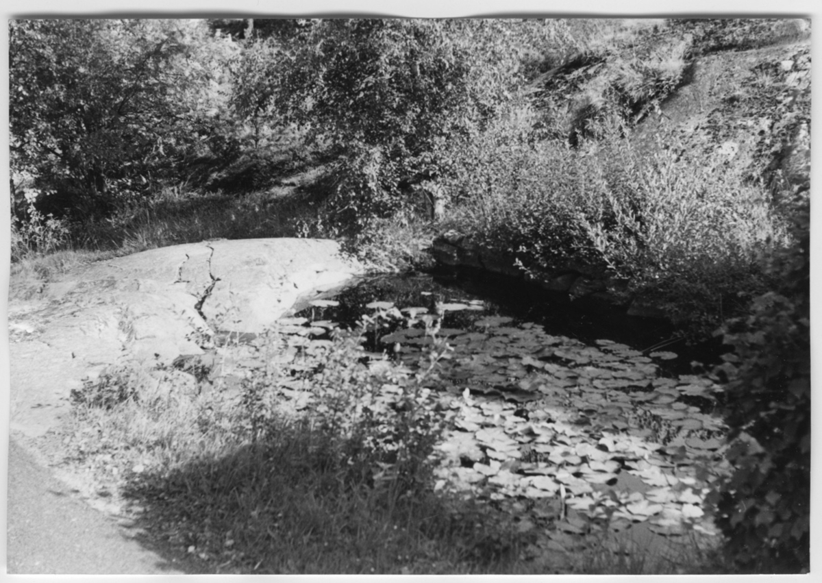 'Bildtext: ''Vattenfyllt klippbäcken.'' Närbild på vattnet med vegetation. :: :: Ingår i serie med fotonr. 6970:1-1125, dokumentation av Hisingens naturgeografi, visande landskapsformerna i stora drag och gjord inför exploateringen av området. Platserna för fotograferingen finns utsatta på karta i skala 1:4000 som finns på Göteborgs Naturhistoriska musem. Fotoriktningen mättes med kompass i gammalgrader.'