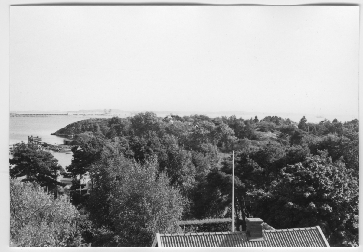 'Bildtext: ''Ytterdel av udde med fritidsbebyggelse. Riklig vegetation (inplanterad lövskog). Riktning 190.'' I förgrunden 1 hustak, vy över viken med bryggor. :: :: Ingår i serie med fotonr. 6970:1-1125, dokumentation av Hisingens naturgeografi, visande landskapsformerna i stora drag och gjord inför exploateringen av området. Platserna för fotograferingen finns utsatta på karta i skala 1:4000 som finns på Göteborgs Naturhistoriska musem. Fotoriktningen mättes med kompass i gammalgrader.'