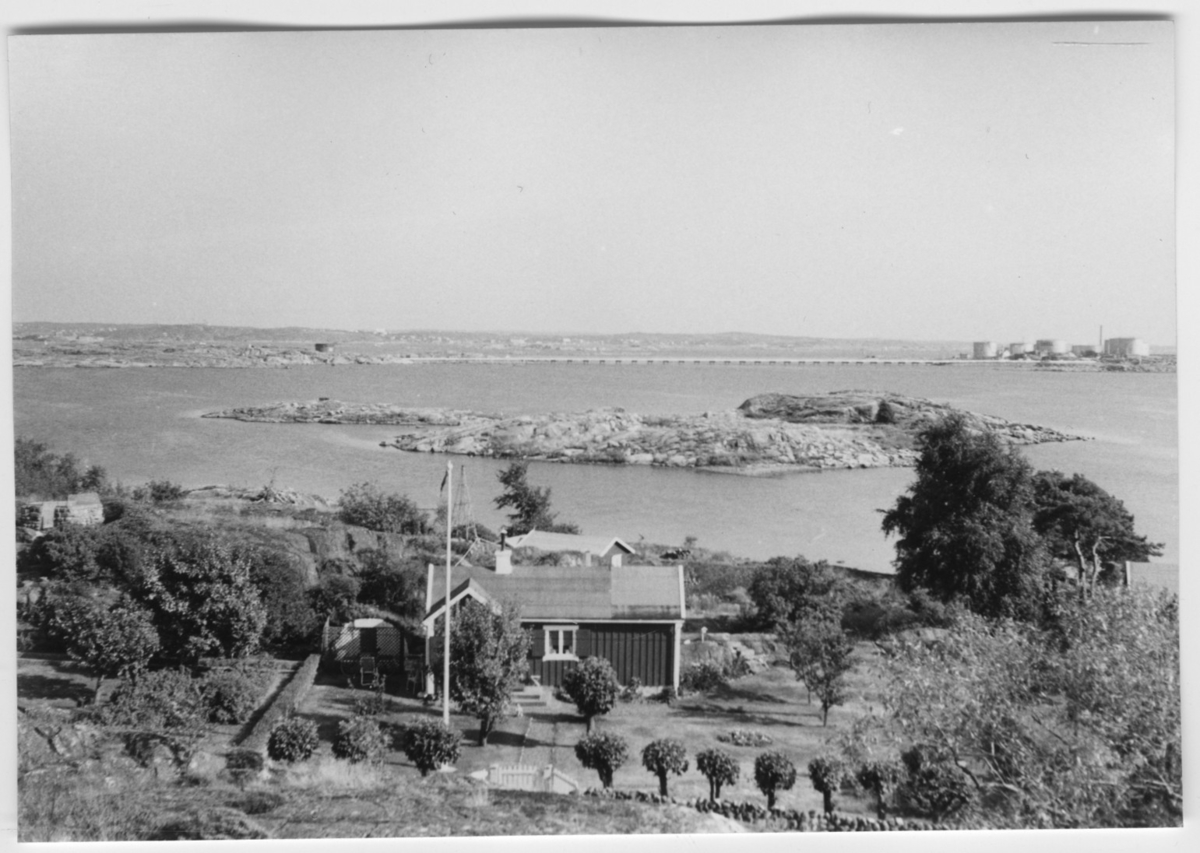 'Bildtext: ''Kobbe med klapperstrand. Riktning 140.''Vy med stuga med jordkällare och flaggstång i förgrunden. Skär strax utanför stranden och på avstånd lång brygga i förbindelse med raffinaderier. :: :: Ingår i serie med fotonr. 6970:1-1125, dokumentation av Hisingens naturgeografi, visande landskapsformerna i stora drag och gjord inför exploateringen av området. Platserna för fotograferingen finns utsatta på karta i skala 1:4000 som finns på Göteborgs Naturhistoriska musem. Fotoriktningen mättes med kompass i gammalgrader.'
