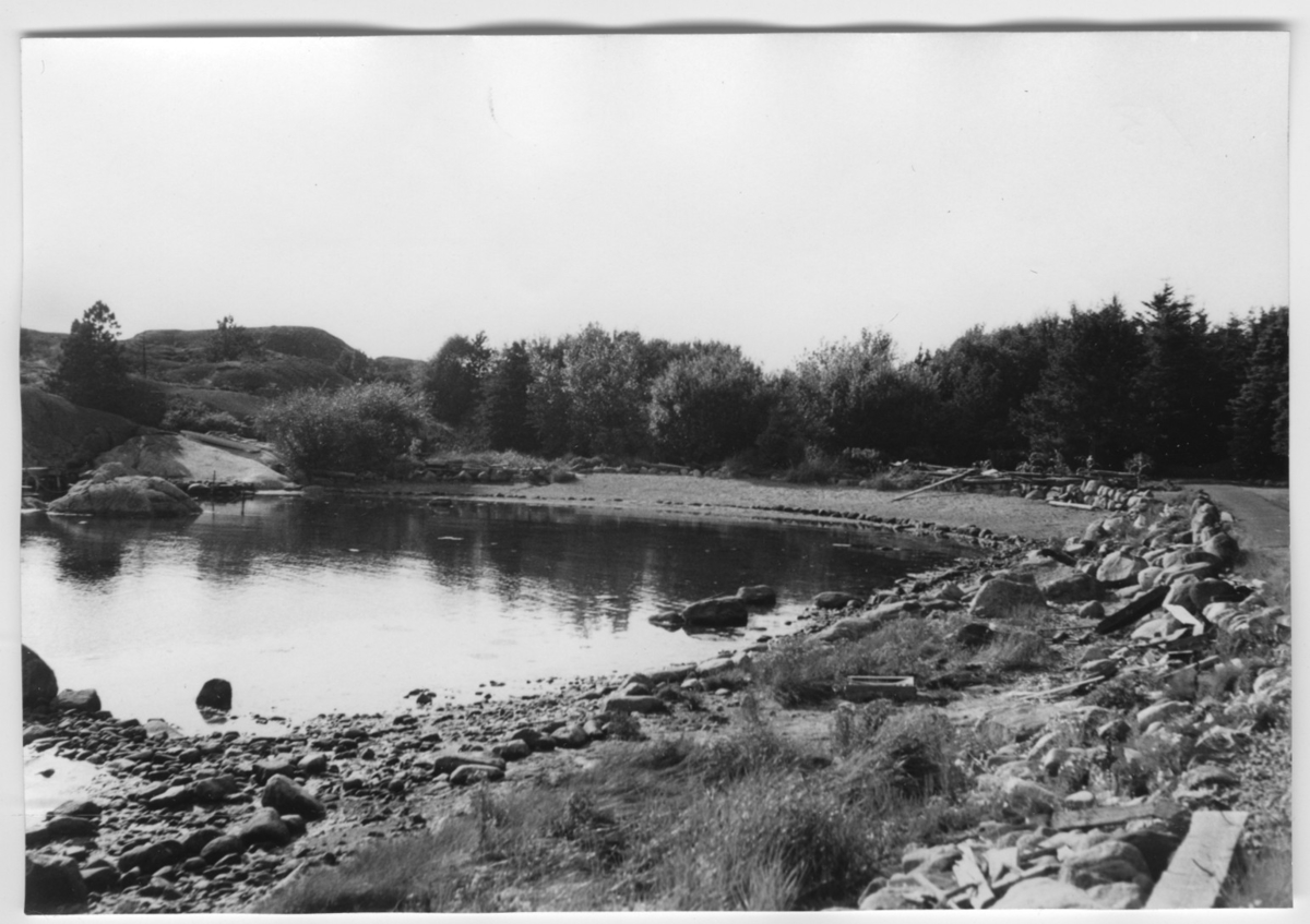 'Bildtext: ''Badvik med sandstrand. Riktning 290.'' Vy över badviken omgärdad av sandstrand samt blockigare partier. Bergshällar synliga. :: :: Ingår i serie med fotonr. 6970:1-1125, dokumentation av Hisingens naturgeografi, visande landskapsformerna i stora drag och gjord inför exploateringen av området. Platserna för fotograferingen finns utsatta på karta i skala 1:4000 som finns på Göteborgs Naturhistoriska musem. Fotoriktningen mättes med kompass i gammalgrader.'