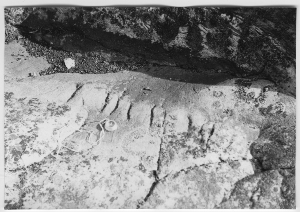 'Bildtext: ''Huggmärken orsakade av isen.'' Närbild på hällen. :: :: Ingår i serie med fotonr. 6970:1-1125, dokumentation av Hisingens naturgeografi, visande landskapsformerna i stora drag och gjord inför exploateringen av området. Platserna för fotograferingen finns utsatta på karta i skala 1:4000 som finns på Göteborgs Naturhistoriska musem. Fotoriktningen mättes med kompass i gammalgrader.'