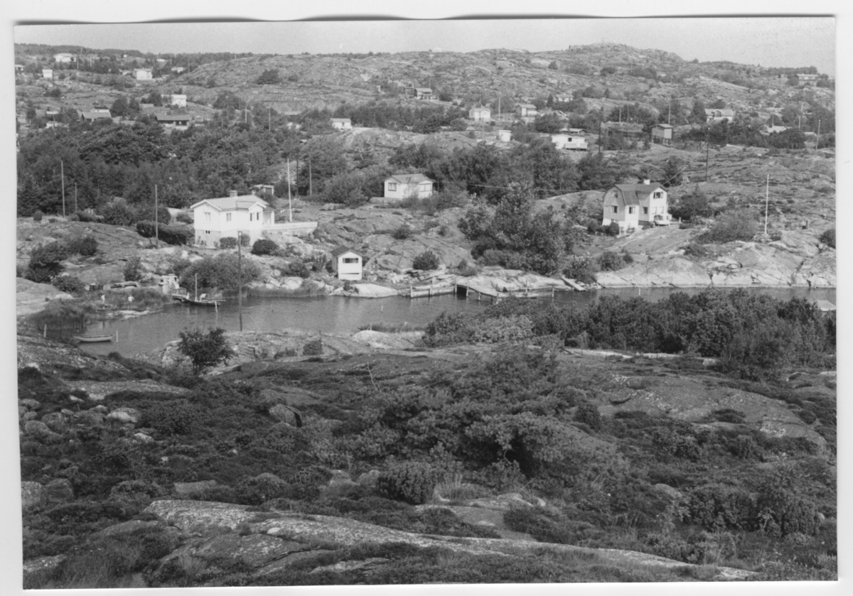 'Bildtext: ''Hällandskap med långsmal havsvik. Riktning 0.'' Vy över berghällar, delvis bevuxna med träd och buskar, spridda hus. Bryggor och småbåtar nere vid vattnet. :: :: Ingår i serie med fotonr. 6970:1-1125, dokumentation av Hisingens naturgeografi, visande landskapsformerna i stora drag och gjord inför exploateringen av området. Platserna för fotograferingen finns utsatta på karta i skala 1:4000 som finns på Göteborgs Naturhistoriska musem. Fotoriktningen mättes med kompass i gammalgrader.'