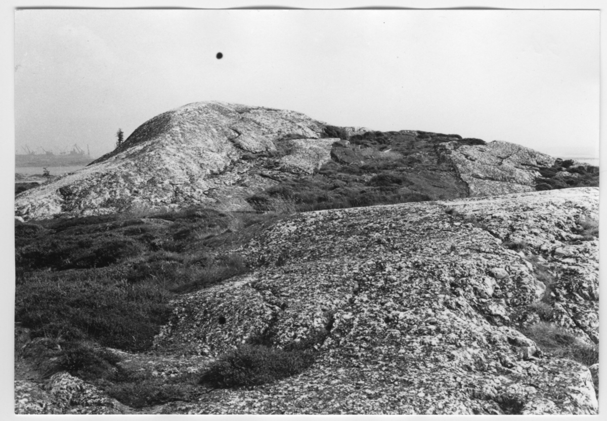 'Bildtext: ''Kvartsgångar.'' Närbild på berghäll med kvarsgångar. I fonden syns profiler av lyftkranar. I fonden syns lyftkranar. :: :: Ingår i serie med fotonr. 6970:1-1125, dokumentation av Hisingens naturgeografi, visande landskapsformerna i stora drag och gjord inför exploateringen av området. Platserna för fotograferingen finns utsatta på karta i skala 1:4000 som finns på Göteborgs Naturhistoriska musem. Fotoriktningen mättes med kompass i gammalgrader.'