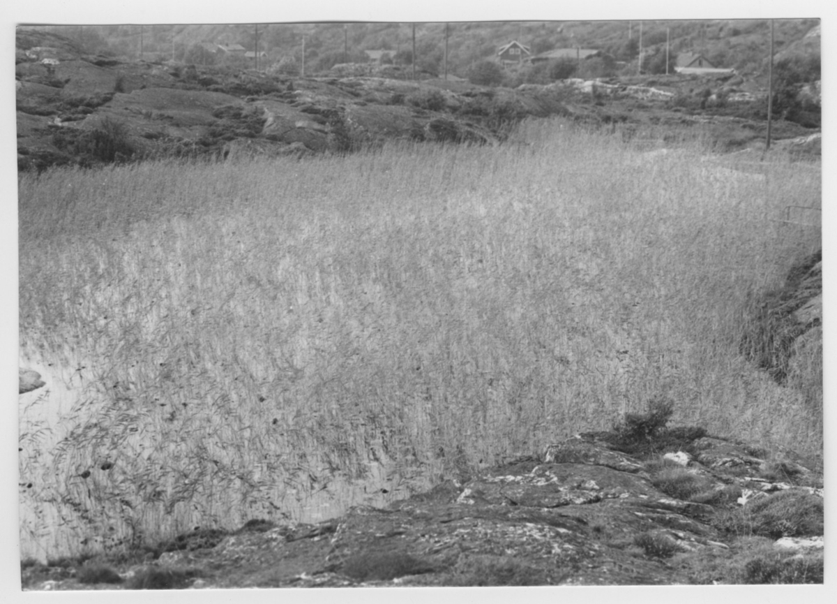 'Bildtext: ''Sjö i klippbäcken. Riktning 320.'' Närbild på sjö i klippbäcken, delvis bevuxen. I fonden hus. :: :: Ingår i serie med fotonr. 6970:1-1125, dokumentation av Hisingens naturgeografi, visande landskapsformerna i stora drag och gjord inför exploateringen av området. Platserna för fotograferingen finns utsatta på karta i skala 1:4000 som finns på Göteborgs Naturhistoriska musem. Fotoriktningen mättes med kompass i gammalgrader.'