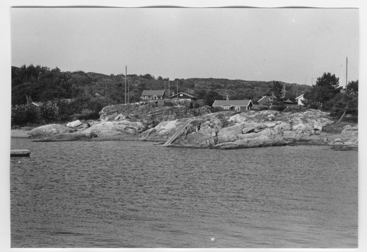 'Bildtext: ''Badvik. Sand i de inre delarna. Riktning 50.'' Ca 5 hus ner mot havet. Badflotte i vattnet, eka och rutschbana på land. :: :: Ingår i serie med fotonr. 6970:1-1125, dokumentation av Hisingens naturgeografi, visande landskapsformerna i stora drag och gjord inför exploateringen av området. Platserna för fotograferingen finns utsatta på karta i skala 1:4000 som finns på Göteborgs Naturhistoriska musem. Fotoriktningen mättes med kompass i gammalgrader.'