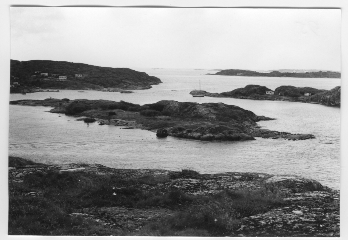 'Bildtext: ''Ö med strandäng. Riktning 200.'' Vy med liten ö, skär, berghällar omkring. I fonden hus och 1 båt på berghäll. :: :: Ingår i serie med fotonr. 6970:1-1125, dokumentation av Hisingens naturgeografi, visande landskapsformerna i stora drag och gjord inför exploateringen av området. Platserna för fotograferingen finns utsatta på karta i skala 1:4000 som finns på Göteborgs Naturhistoriska musem. Fotoriktningen mättes med kompass i gammalgrader.'