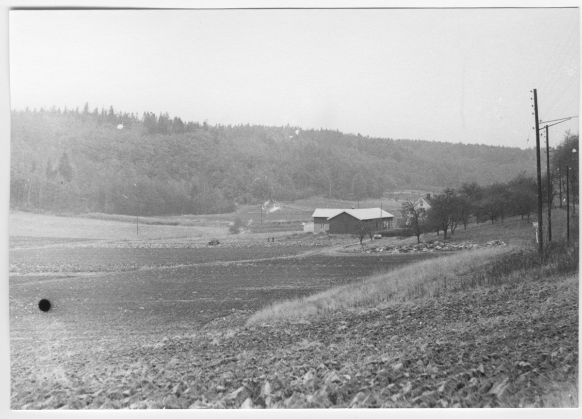 'Bildtext: ''Djupadal. Sedimentslätt. Riktning 176.'' :: Vy med öppna fält, åkermark och traktor. Med gårdsbyggnader. I fonden skogsklädda berg. :: :: Ingår i serie med fotonr. 6970:1-1125, dokumentation av Hisingens naturgeografi, visande landskapsformerna i stora drag och gjord inför exploateringen av området. Platserna för fotograferingen finns utsatta på karta i skala 1:4000 som finns på Göteborgs Naturhistoriska musem. Fotoriktningen mättes med kompass i gammalgrader.'