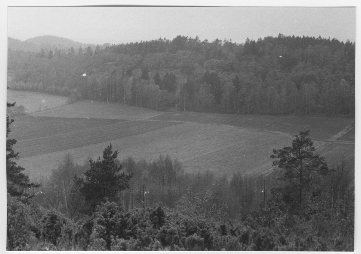 'Bildtext: ''Sedimentyta. Riktning 273.'' :: Vy ned över öppet fält, åkermark med angränsande trädbevuxna berg på sidorna. :: :: Ingår i serie med fotonr. 6970:1-1125, dokumentation av Hisingens naturgeografi, visande landskapsformerna i stora drag och gjord inför exploateringen av området. Platserna för fotograferingen finns utsatta på karta i skala 1:4000 som finns på Göteborgs Naturhistoriska musem. Fotoriktningen mättes med kompass i gammalgrader.'