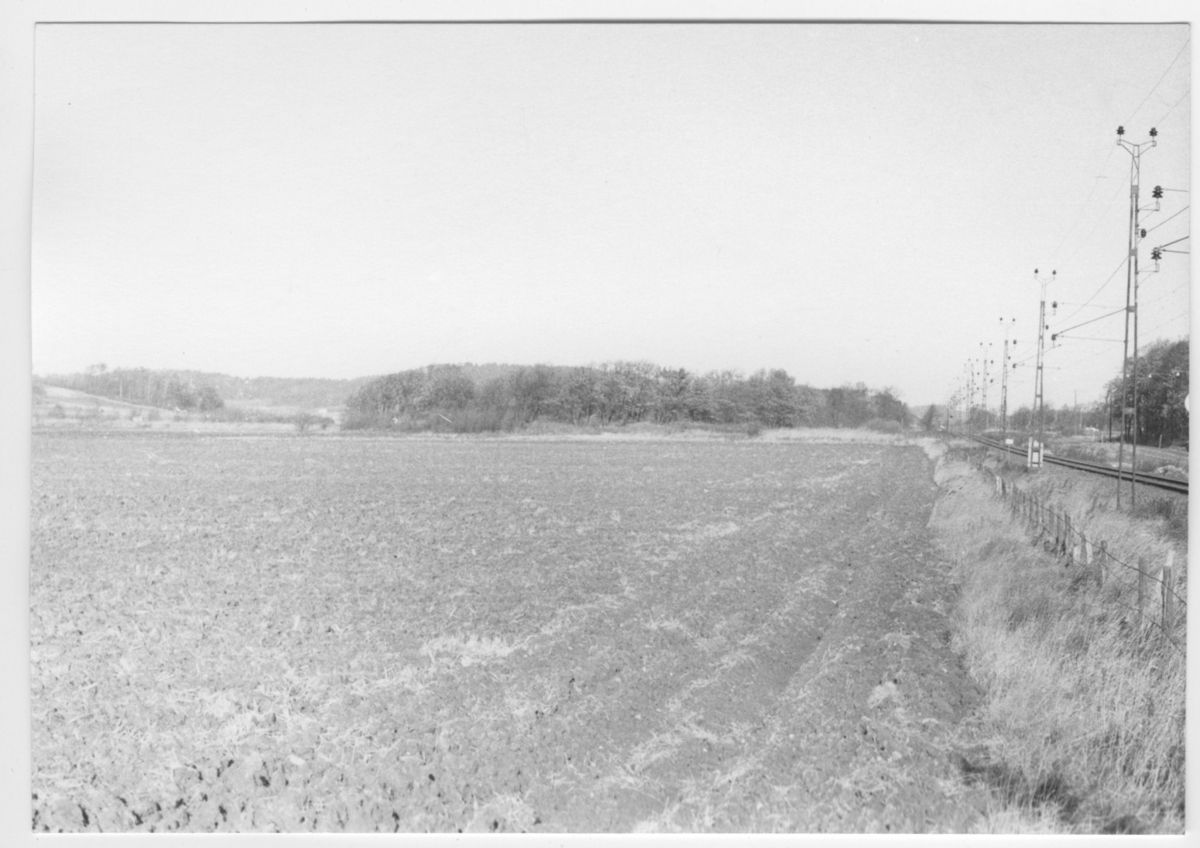'Bildtext: ''Sedimentdalgång. Riktning 341.'' :: Vy över öppet fält, åkermark med intilliggande järnvägsspår. På avstånd trädvegetation. :: :: Ingår i serie med fotonr. 6970:1-1125, dokumentation av Hisingens naturgeografi, visande landskapsformerna i stora drag och gjord inför exploateringen av området. Platserna för fotograferingen finns utsatta på karta i skala 1:4000 som finns på Göteborgs Naturhistoriska musem. Fotoriktningen mättes med kompass i gammalgrader.'