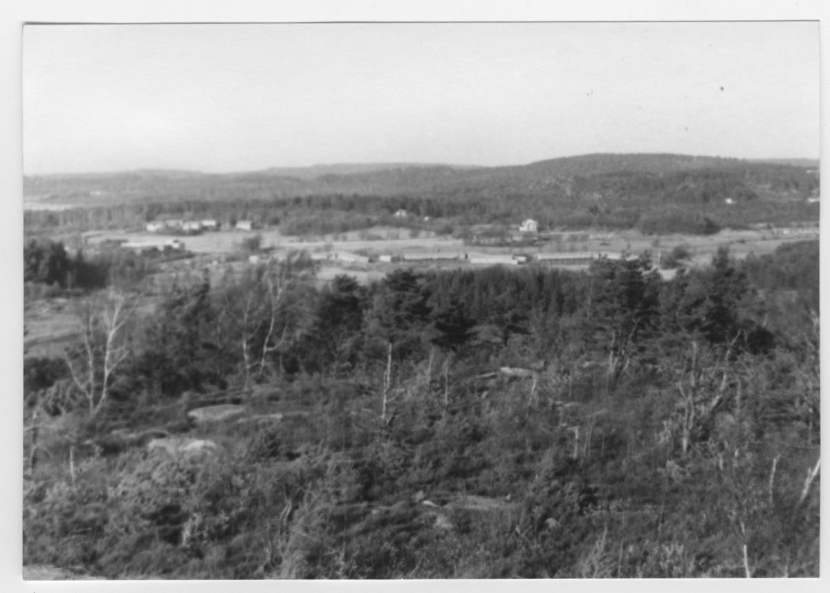 'Bildtext: ''Kvillens dalgång. Riktning 355.'' :: Vy med område med trädvegetation, skog och öppnare fält samt hus, ev. gårdar. :: :: Ingår i serie med fotonr. 6970:1-1125, dokumentation av Hisingens naturgeografi, visande landskapsformerna i stora drag och gjord inför exploateringen av området. Platserna för fotograferingen finns utsatta på karta i skala 1:4000 som finns på Göteborgs Naturhistoriska musem. Fotoriktningen mättes med kompass i gammalgrader.'