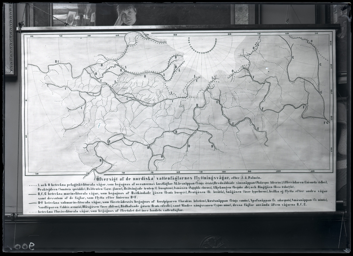 Karta. Översikt av de nordiska vattenfåglarnas flyttningsvägar. (Efter J.A. Palmén).