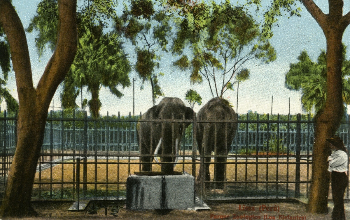 '2 st elefanter innanför staket, 1 person står utanför. Text på vykortet: ''Lon Elefantes.'''