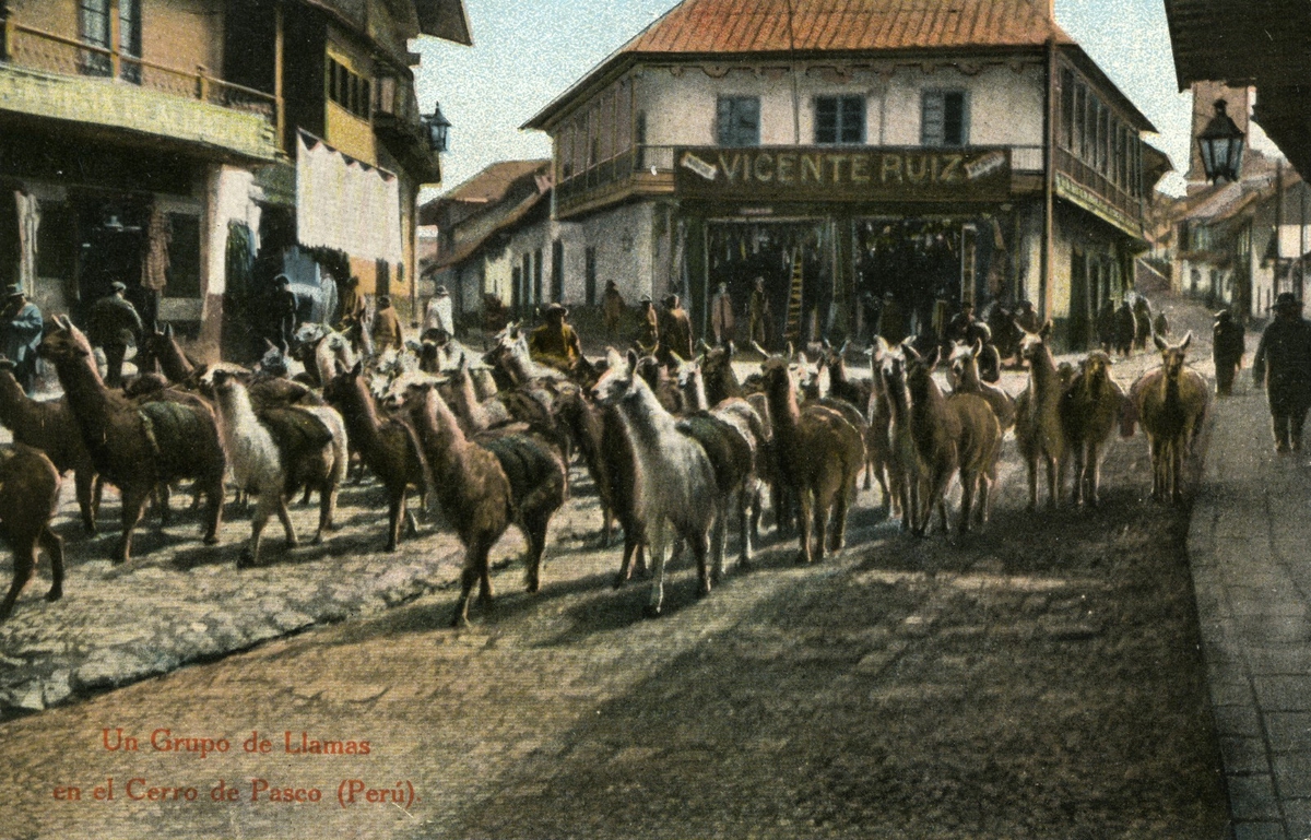 'Flock lamadjur på gator i stad.Text på vykortet: ''Un grupo de Llamas en el Cerro de Pasco.'''