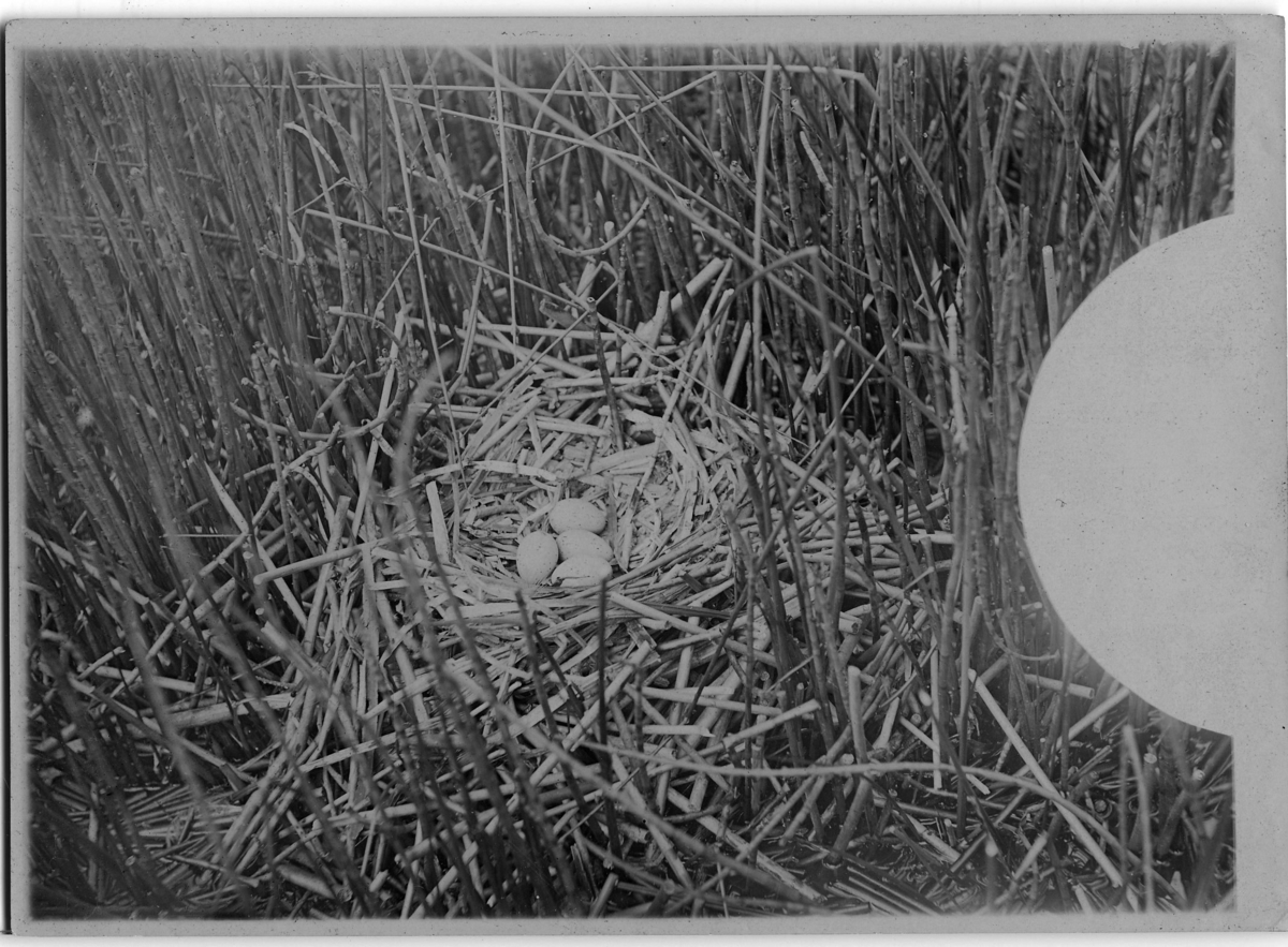 'Sothöna, bo med 4 ägg i vass. Bilden något svag. :: :: Ingår i serie med fotonr. 96-105.'