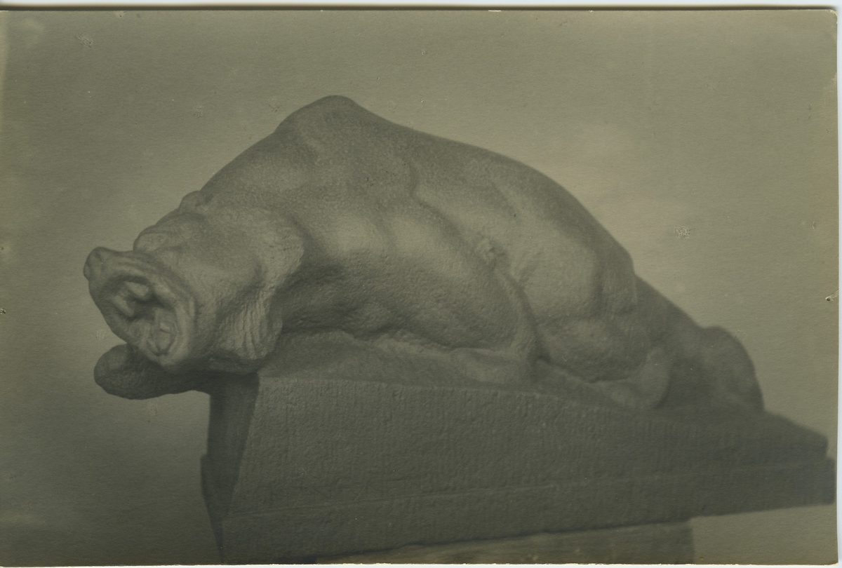 '''Sårad björn'' (huggen i diorit). Storlek 58x37 cm pris 700 kr. Skulptur av Richard Mäntynen. :: :: Serie fotonr 972-982 av stiliserade djurskulpturer.'