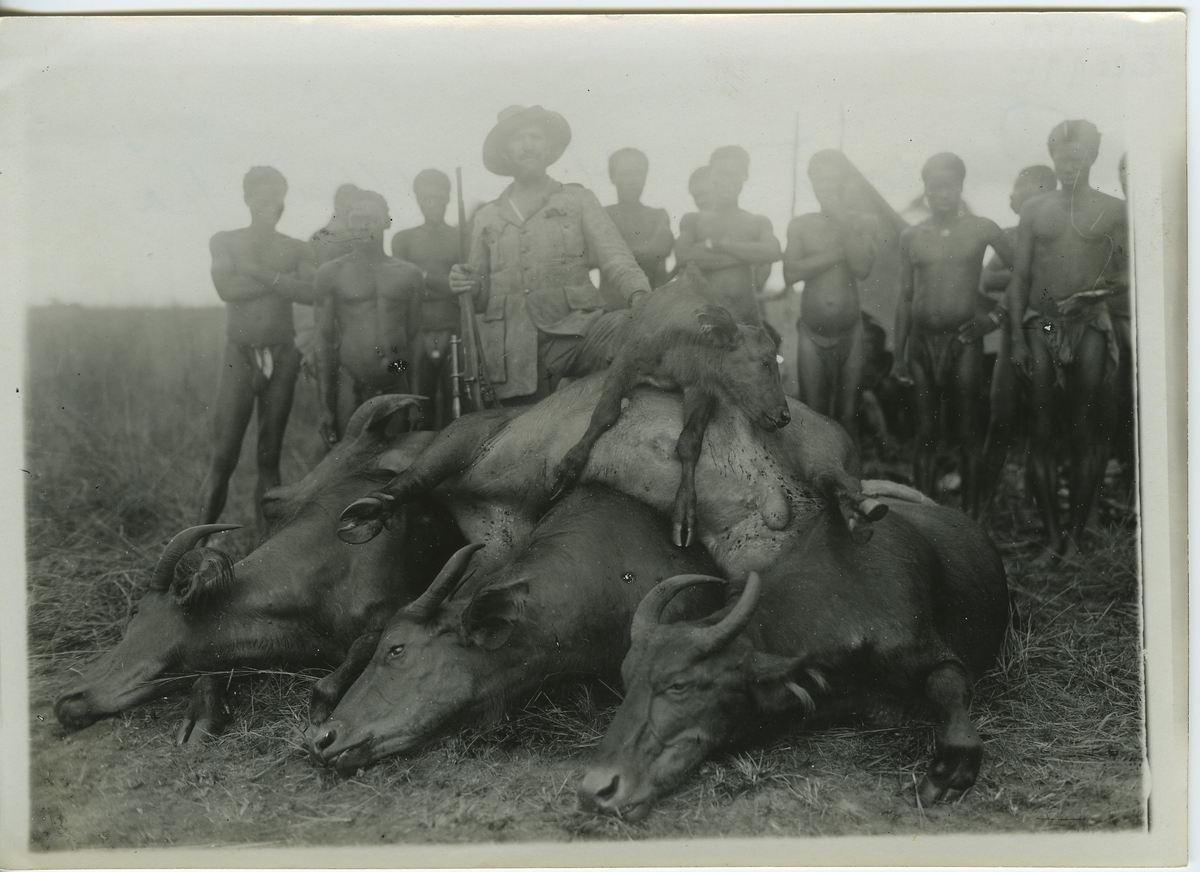 '4 bufflar, vuxna djur, samt 1 kalv liggande döda i en hög. 3 djur på marken och 1 fjärde tvärs över samt kalven överst. Bakom står 1 man med gevär och hatt (S. Molin?). Bakom honom står ytterligare cirka 11 män, iklädda höftbeklädnad. På baksidan av fotot står ''Rekord = 4 bufflar på 40 sekunder med en 10,7 mm mauser''. Kläder. Klädsel. :: :: Ingår i serie med fotonr. 983-996'