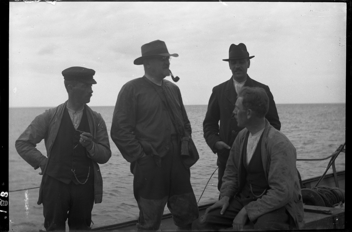 'Från skrapturen med båten ''Sven Lovén'' utanför Göteborg: :: 4 män på båtdäck, Leonard Axel Jägerskiöld andra från vänster med pipa. :: :: Ingår i serie med fotonr. 878-882.'