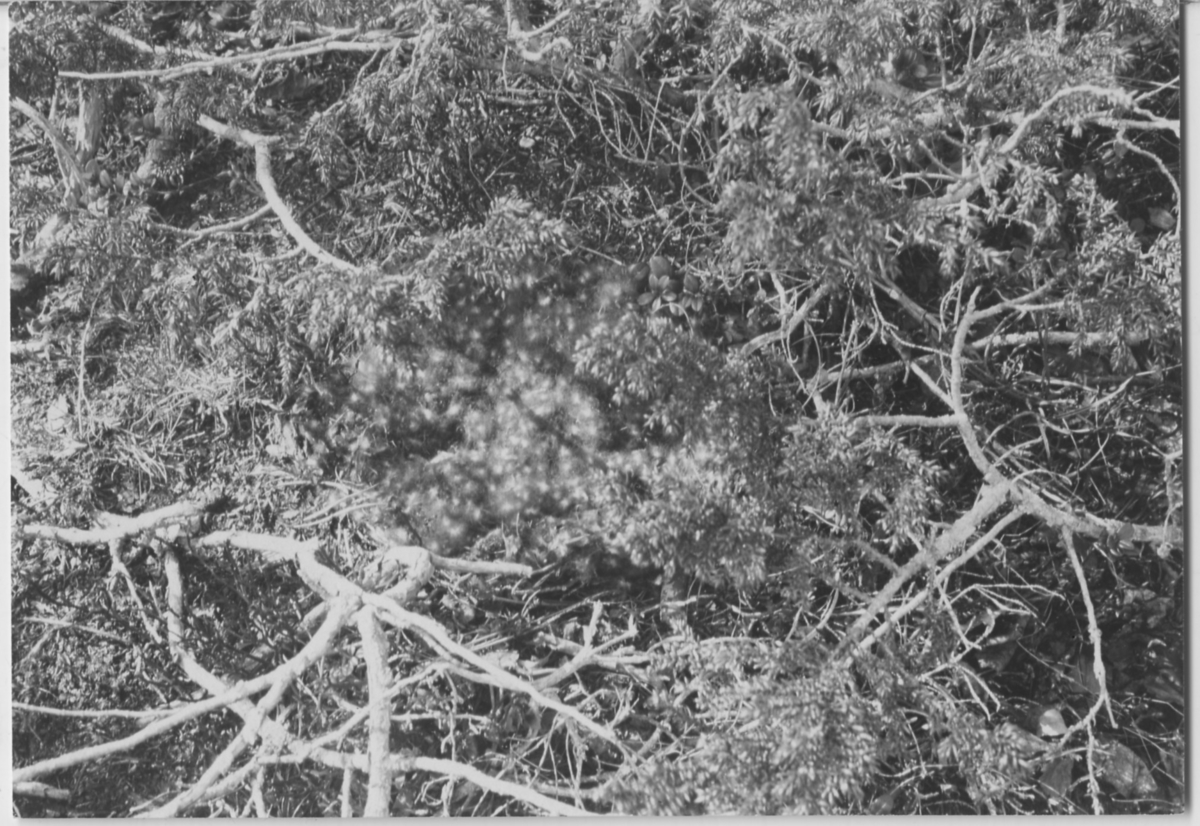'Övertäckt bo av alfågel, övertäckt med dun? Bland grangrenar och lingonris. :: :: Se fotonr. 147-148. :: :: Ingår i serie med fotonr. 128-148.'