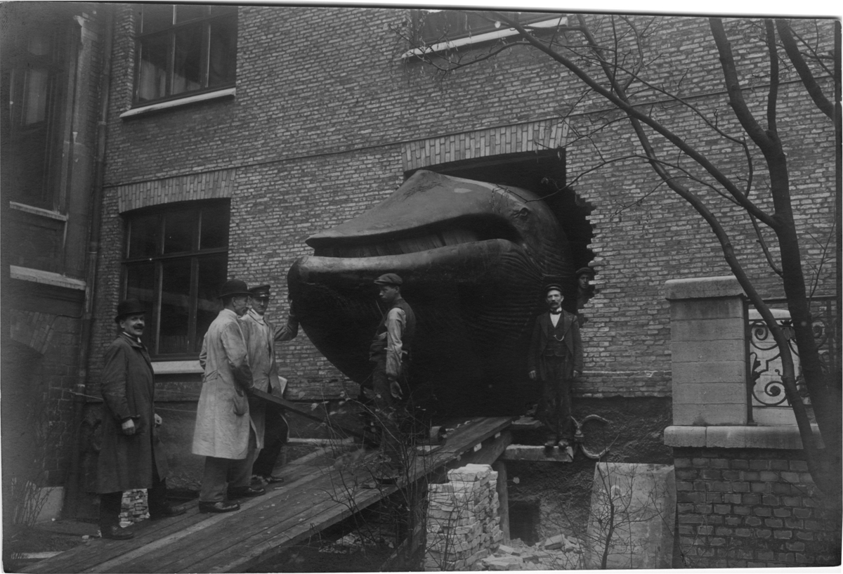 'Zoologiska avdelningens flytt: :: :: Valhuvudet passerar det förstorade fönstret i gamla museibyggnaden. :: Malmska valen. Huvudet fotograferat snett framifrån, passerande genom väggen. 5 män står på och invid rampen som huvudet transporteras på.'